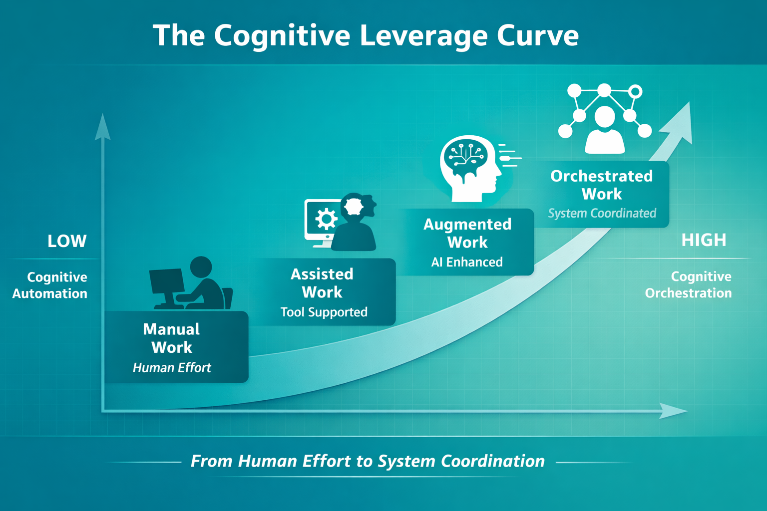 The progression of work under AI can be understood through the Cognitive Leverage Curve, which describes four stages: